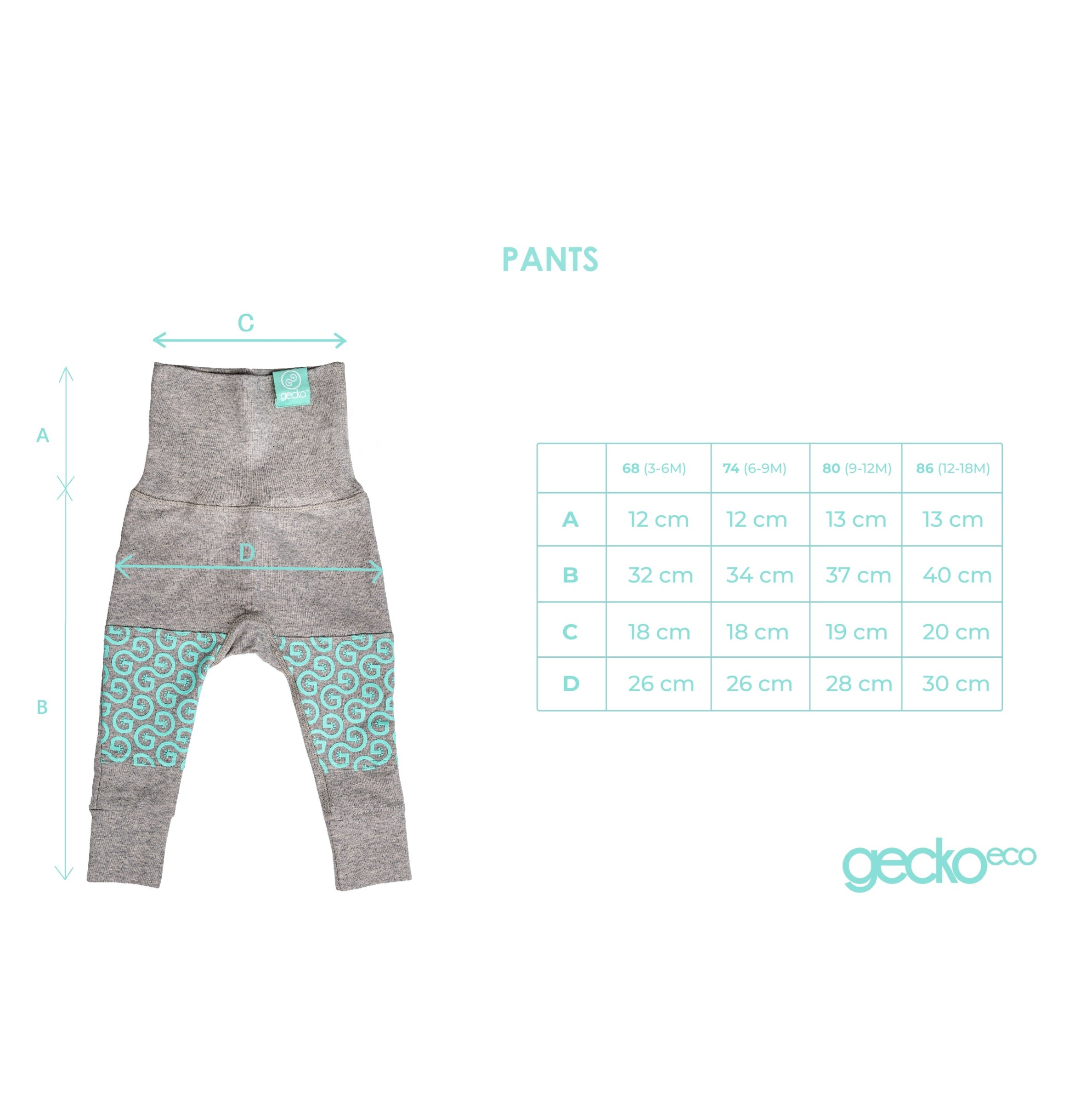 Thanks to its double fastening feature, the Geckoeco anti-slip long overall is designed to grow with your child. To select the right size, measure your baby’s body at home and compare it with size A listed on our size chart. This will ensure a fit that allows your baby to wear the trousers comfortably for an extended period.